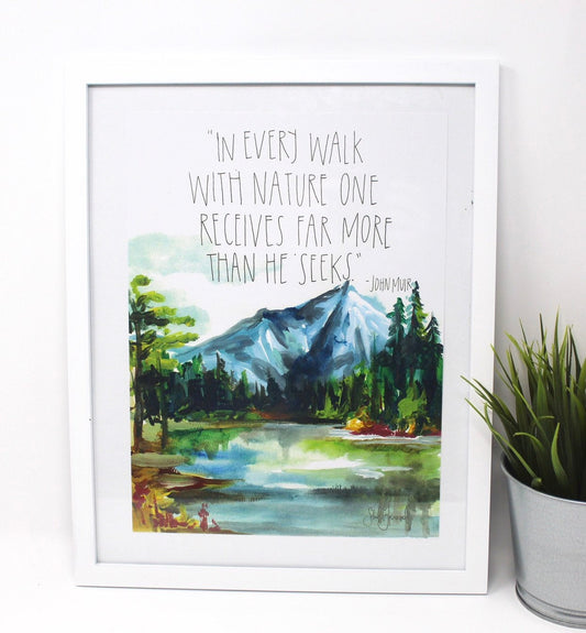 Mountains Watercolor Art Print- 11x14in, Home Decor, Wall Art, Adventure Artwork, John Muir Quote