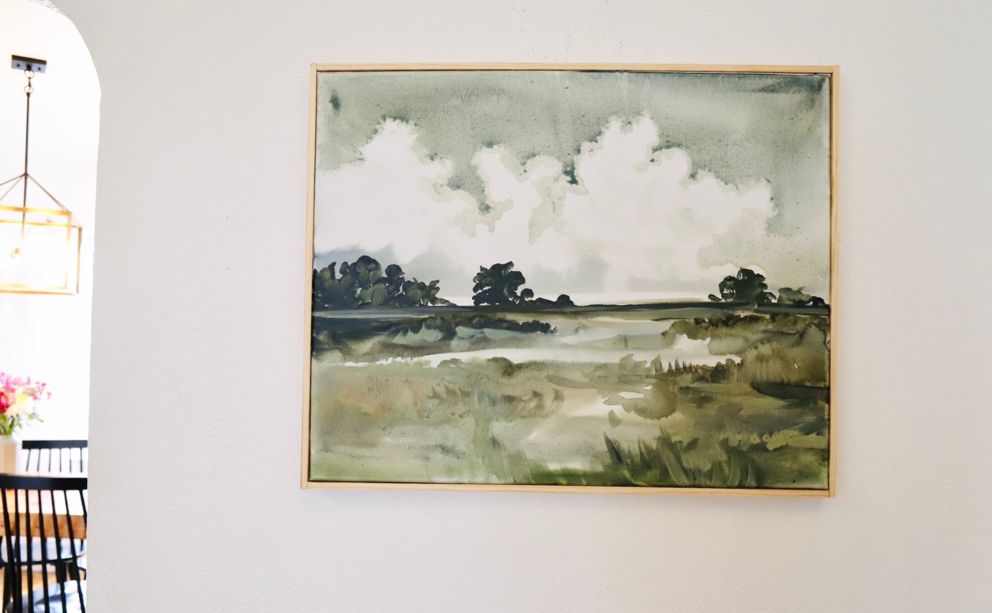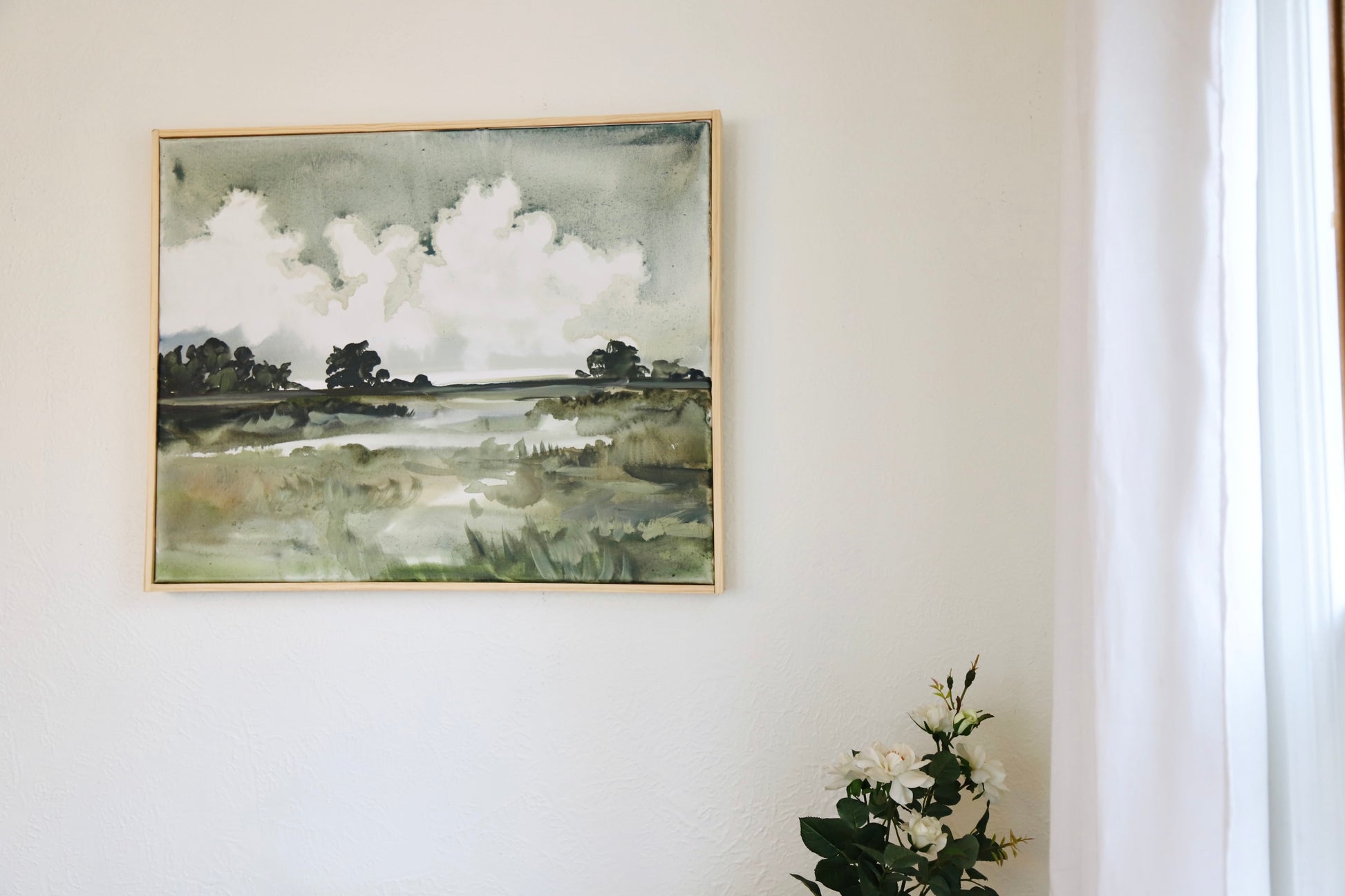 Light wood framed in 24x30 inch canvas. This painting is done with acrylic, watercolor, varnish. Created by Shelby Kregel in 2024 all rights reserved.