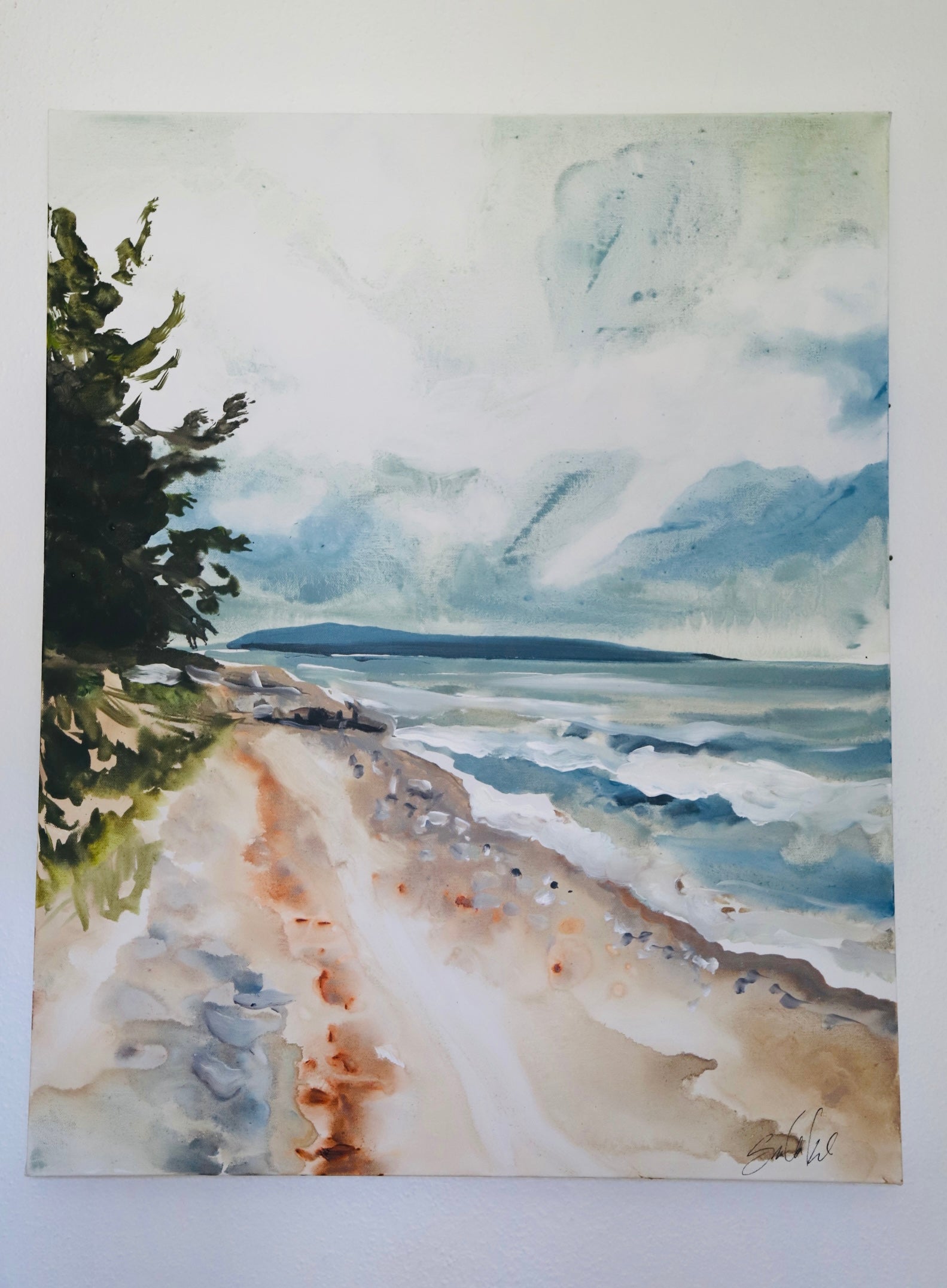 This beach scene exudes all the feels of summertime. From the copper-colored sandy shore to the intensity of green in the trees to the bright blue hues of the water. This piece reminds us of the memories made in this carefree season, and also holds our anticipation of those memories yet to be made.